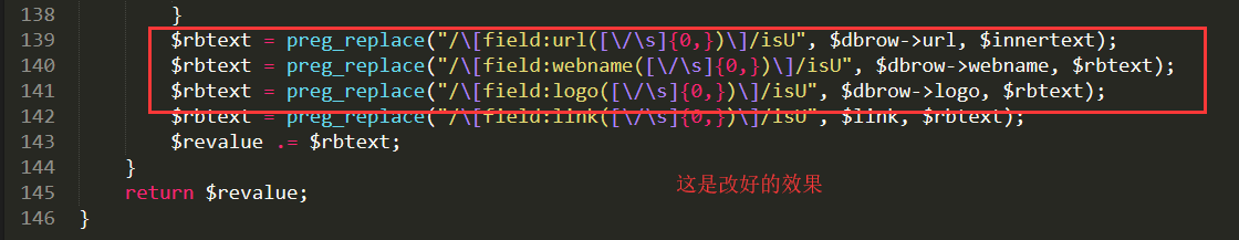 $rbtext = preg_replace("/\[field:url([\/\s]{0,})\]/isU", $row['url'], $innertext);$rbtext = preg_replace("/\[field:webname([\/\s]{0,})\]/isU", $row['webname'], $rbtext);$rbtext = preg_replace("/\[field:logo([\/\s]{0,})\]/isU", $row['logo'], $rbtext);